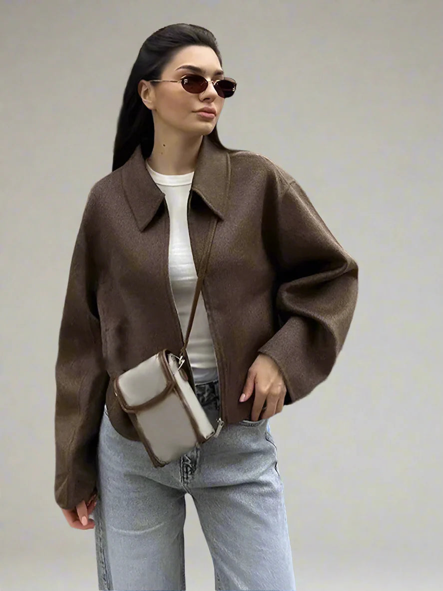 Opgrader din garderobe med denne smukt skræddersyede uldjakke, designet til kvinder, der værdsætter en elegant og ubesværet stil. Med sin sofistikerede revers, strukturerede pasform og stilfulde lynlåslukning er denne korte jakke det perfekte lag til enhver lejlighed. Uanset om du kombinerer den med jeans for et afslappet streetwear-look eller bærer den over en kjole for et mere eksklusivt udtryk, udstråler denne jakke selvtillid og klasse.